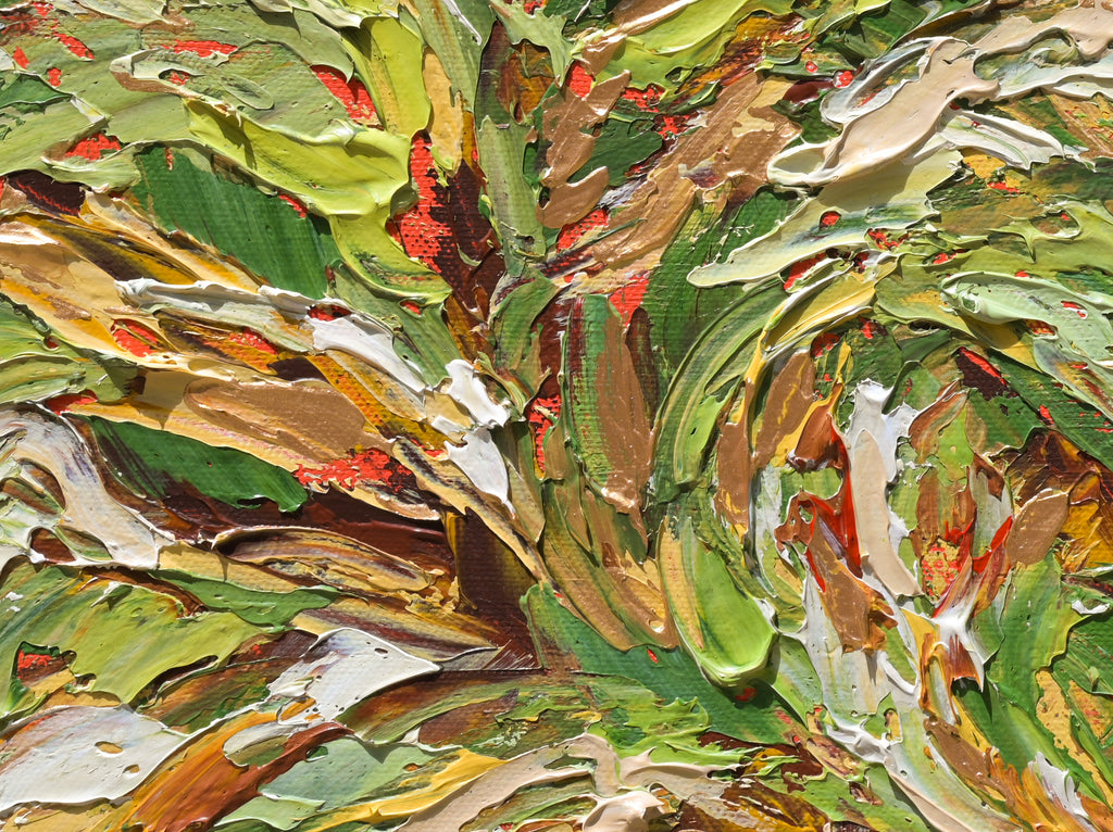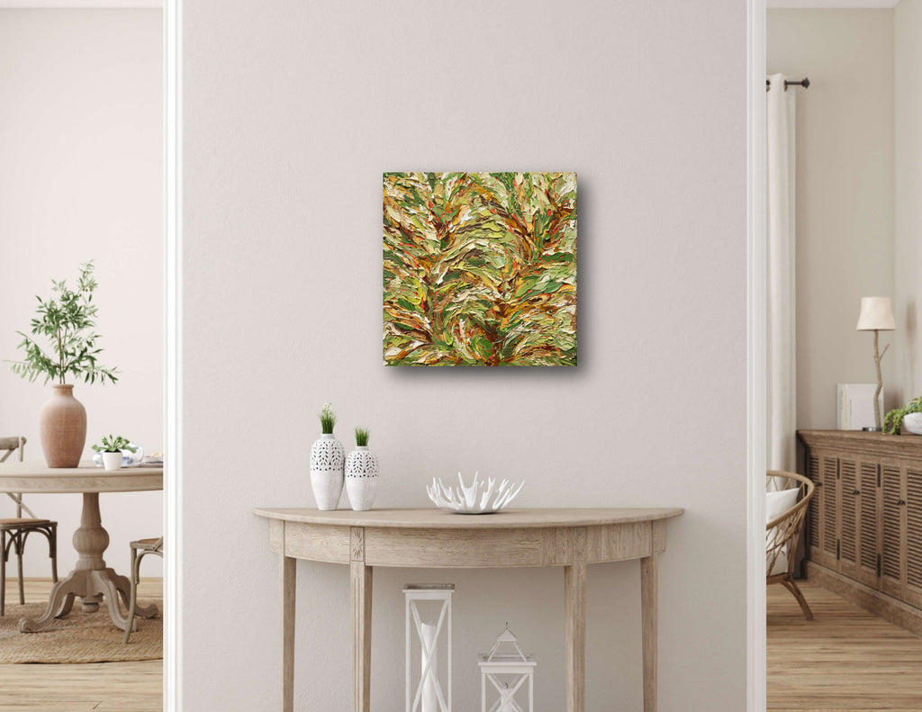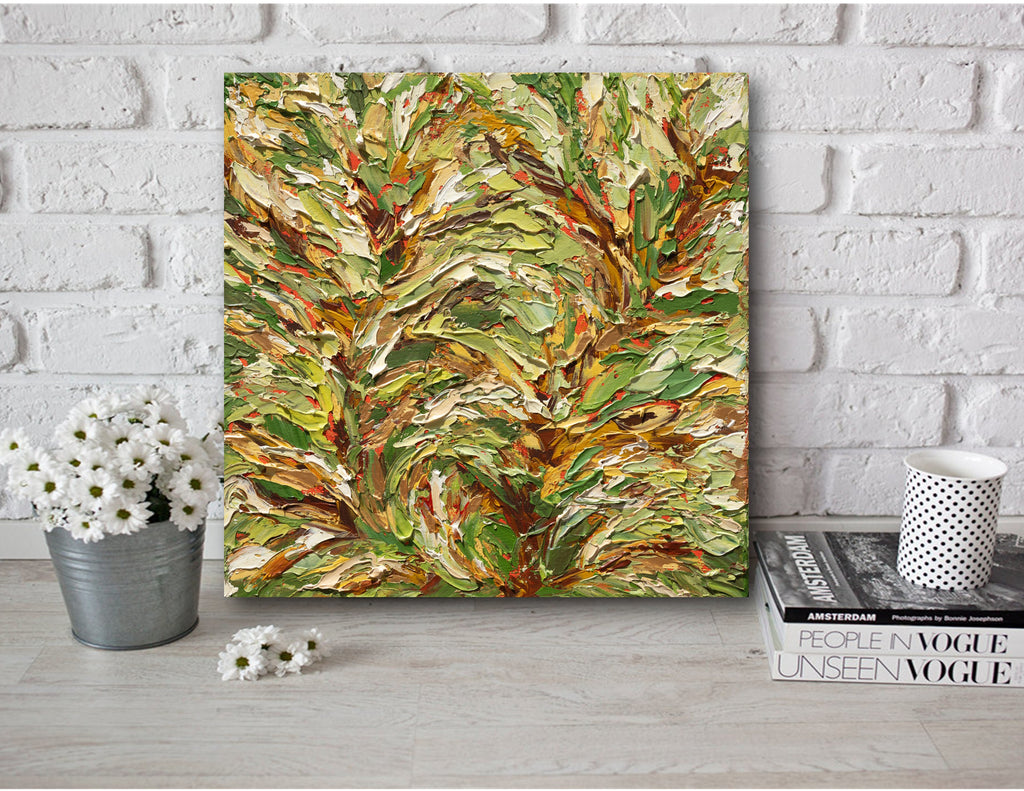 Bold colors, an accent piece of abstract art in a palette knife technique, makes a stylish focal point for your home or office. Heavy textures of this acrylic artwork add interest, depth, and a sense of movement to the design. The colors used are gold, yellow, green, blue, and ochre. This stunning, hand-painted, and one of a kind modern wall art surely will add style and personality to your walls.