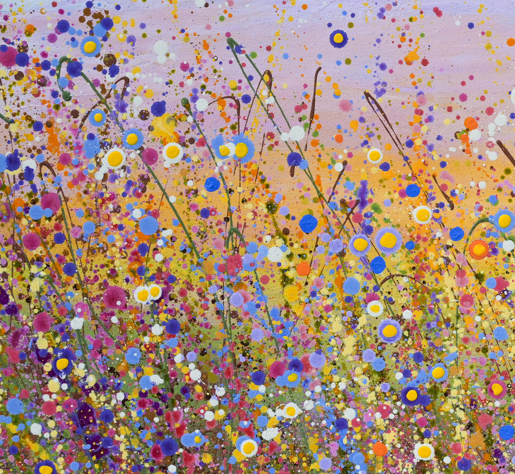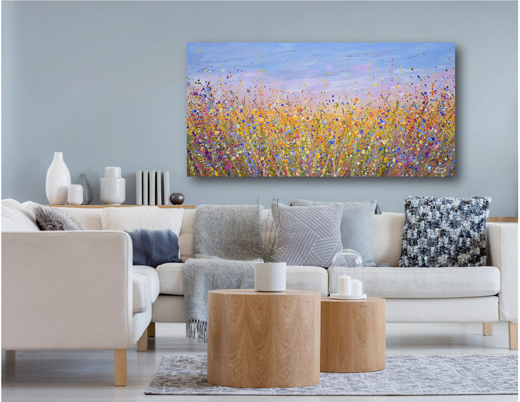 This is one of a kind abstract wildflower landscape painting. Created using acrylics on stretched canvas. Beautiful, vibrant blue, yellow, pink  wildflower wall art canvas would be a great addition to any art collection or a perfect gift for your loved ones.